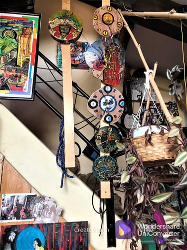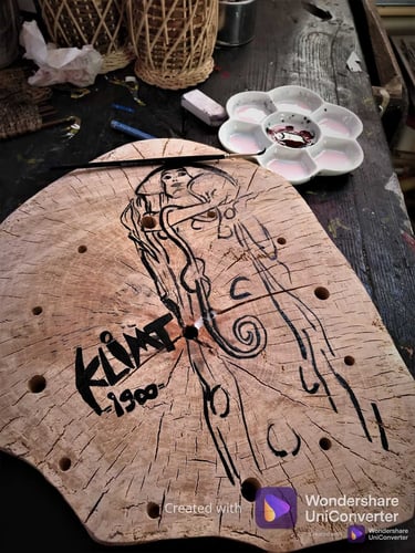 The colour filling is first done in transparent acrylic ink, allowing the veins of the wood to appear, then the details are passed to the Posca after the first coats of varnish.