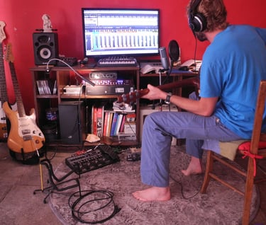 This Home-studio allows me to discover and test many things in terms of sound recordings and musical production as a whole. Just the fact of being able to mix everything with speakers and not with headphones helps to improve the result. I work on instrument, amps and pedals settings, I try different positions and microphone combinations, values of preamps and compressors at the socket etc. I would keep many of these methods afterwards to gain speed/quality and be able to concentrate on the music itself.