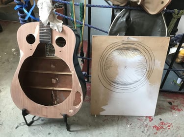 j'ai réussi à la remplacer par une table érable, rajouté un chevalet flottant et je l'ai électrifiée avec un micro type telecaster, la table est peinte/vernie cellulosique à la bombe