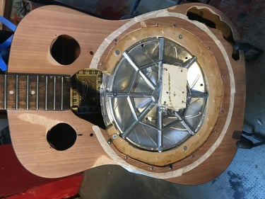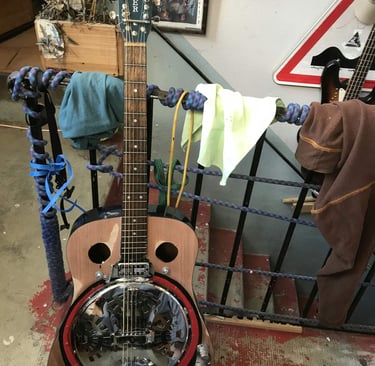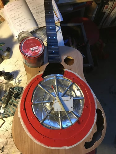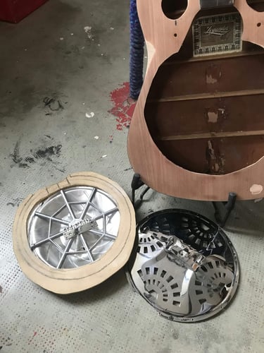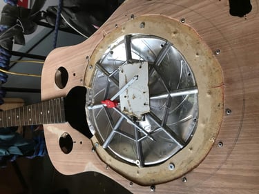 j'y ai installé un kit resonator et un micro venant de ma fender coronado, le placement de la gamelle en métal a été plus compliquée que prévu, du coup je l'ai reprise ensuite.