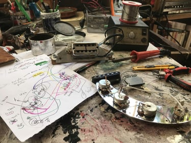 je m'étais fait plaisir avec 2 micros gibson qui sonnent terrible! à la base j'avais fait LE fameux câblage Jimmy Page avec pleins de positions possibles et combinables via des potards push-pull (série/parallèle; humbuckers splitables et positions or-phase