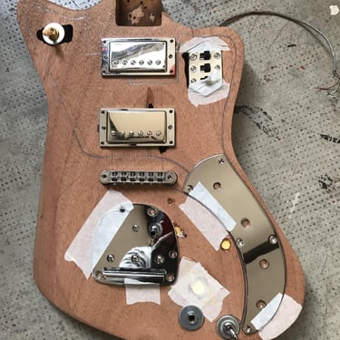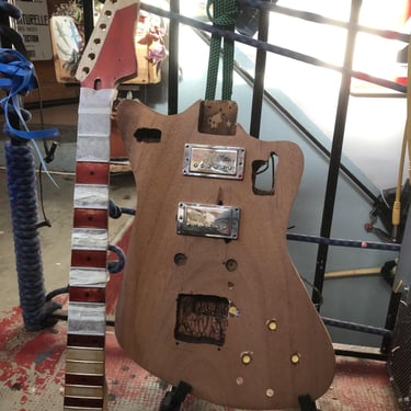 le corps a été découpé dans une table d'acajou une pièce, j'ai voulu faire un mélange entre une forme de jazzmaster et de firebird