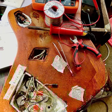 j'avais dû remplacer les potards d'origine, les micros (énormes comme tt sur cette guitare!!!) fonctionnaient, j'avais remplacé la sortie DIN 5 points (normes soviétiques d'époque ;) ) par un jack standard
