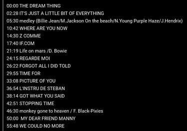une sélection de 14 titres (parmi 440 quand-même) , que je joue en solo dans les rues ou sur des petites scènes