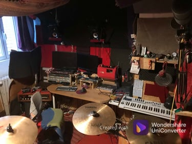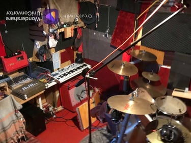 On emménage à Aigues-Vives courant 2017 et je peux "construire" mon premier vrai home-studio. En plus du reste c'est la batterie la grande nouveauté, au départ une caisse claire, un charlé et une crash, le cajon fait office de grosse caisse. Plus tard s'ajouteront progressivement une ride, d'autres crash et des toms, je ferais une petite grosse caisse à partir du tom 16pouces en mettant des peaux adéquates. Le nombre de micros augmentent proportionnellement au fil de bonnes affaires : Rode NT1a (voix & bass), Audix D6 (kik); un deuxième p120 (overheads et prises acoustiques), un octava MK012 (caisse claire et amplis).